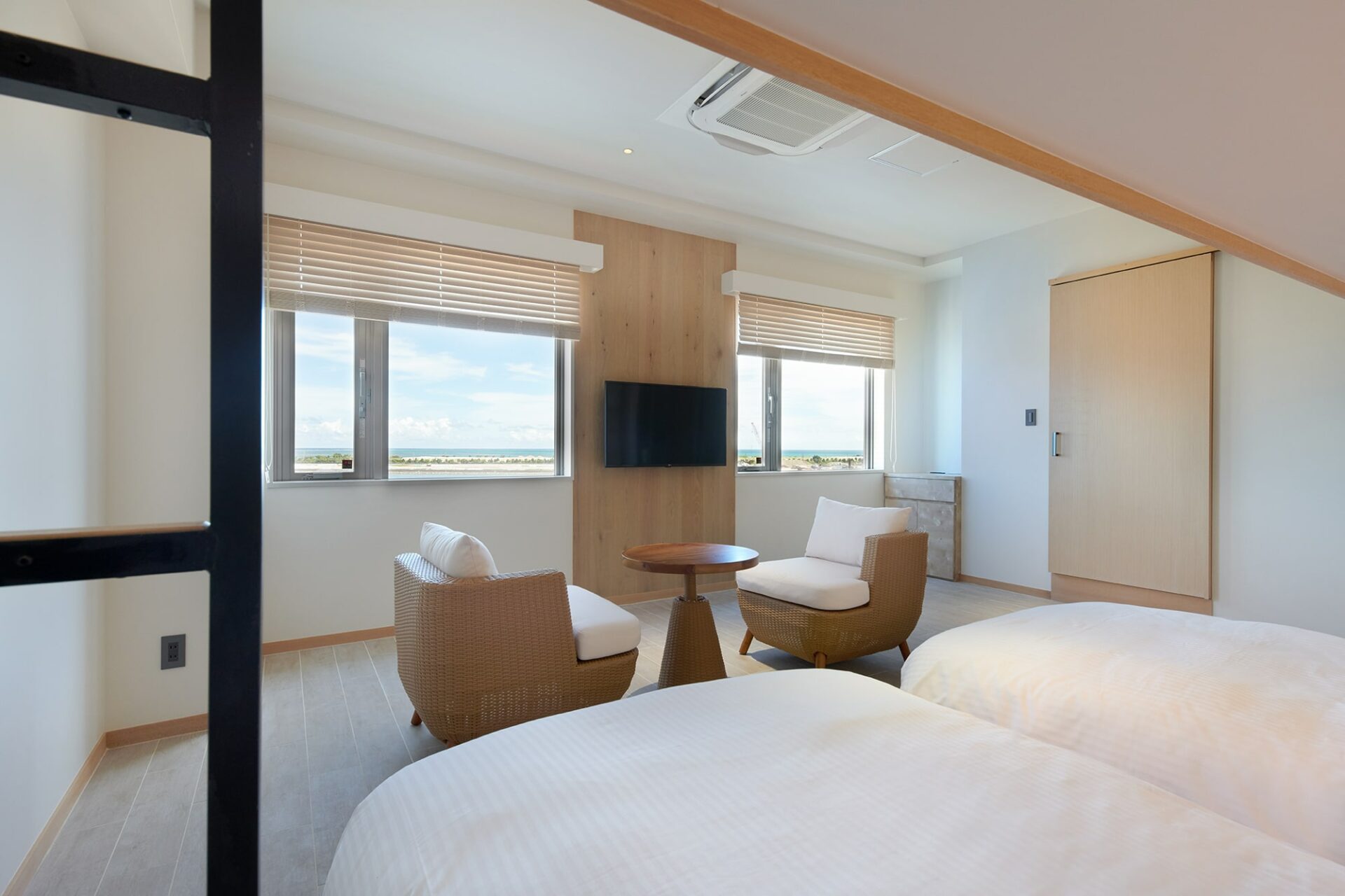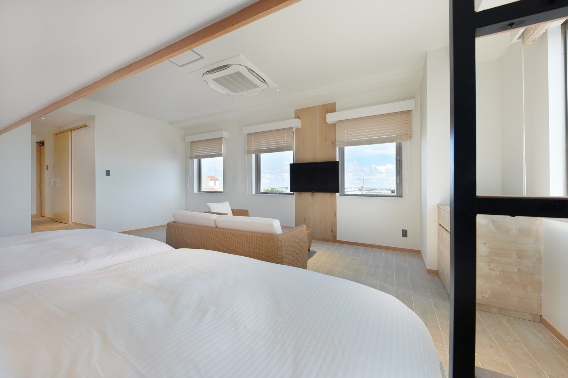 THIRD石垣島の魅力が詰まった、ワンランク上の滞在を楽しみたい方のための特別なスイートルーム。Jrスイートは50㎡、サウナスイートは98㎡ある開放感ある空間。広い窓から海と空を眺める、ゆったりしたひとときを。