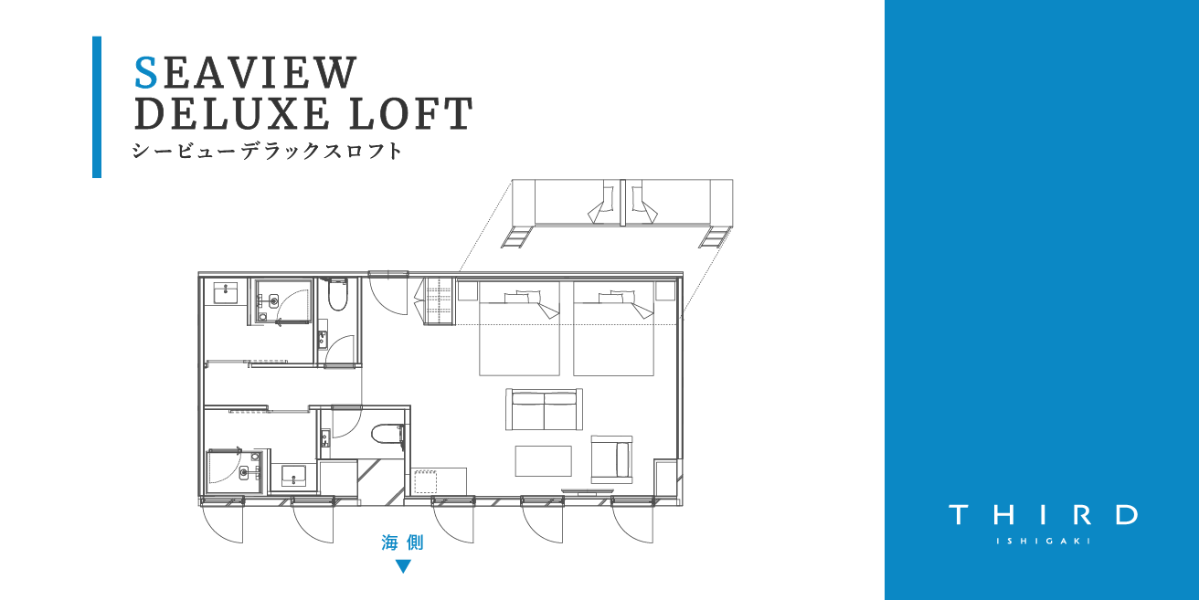 海が見える遊び心あるロフトルームは、大切な友人やご家族とのステイを楽しみたい方のために。同じ部屋で過ごす時間は、旅の時間をより上質に。クイーンサイズベッドが2つ、セミダブルサイズベッドが2つあります。シャワールーム、トイレも2つあり、複数人でも快適にお過ごしいただけます。