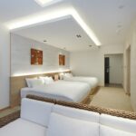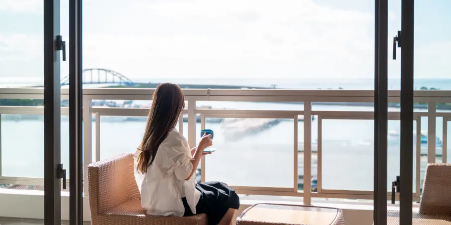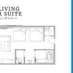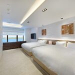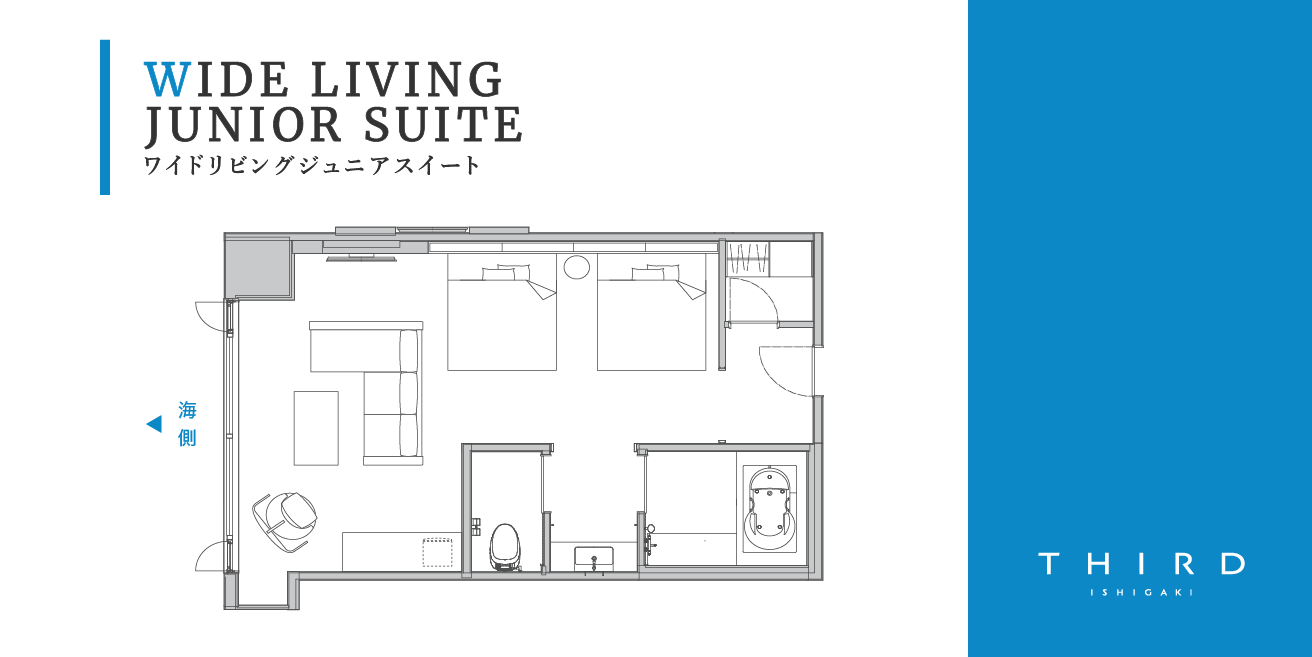 広々とした50㎡の空間と、大きな窓とゆったりしたリビングが特徴のシービュー ワイドリビング ジュニアスイート。石垣ブルーの海を眺めながらゆったりとした特別な時間をお過ごしいただけます。キングサイズベッドが2つあり、エキストラベッドを入れることで最大5名までご宿泊できます。